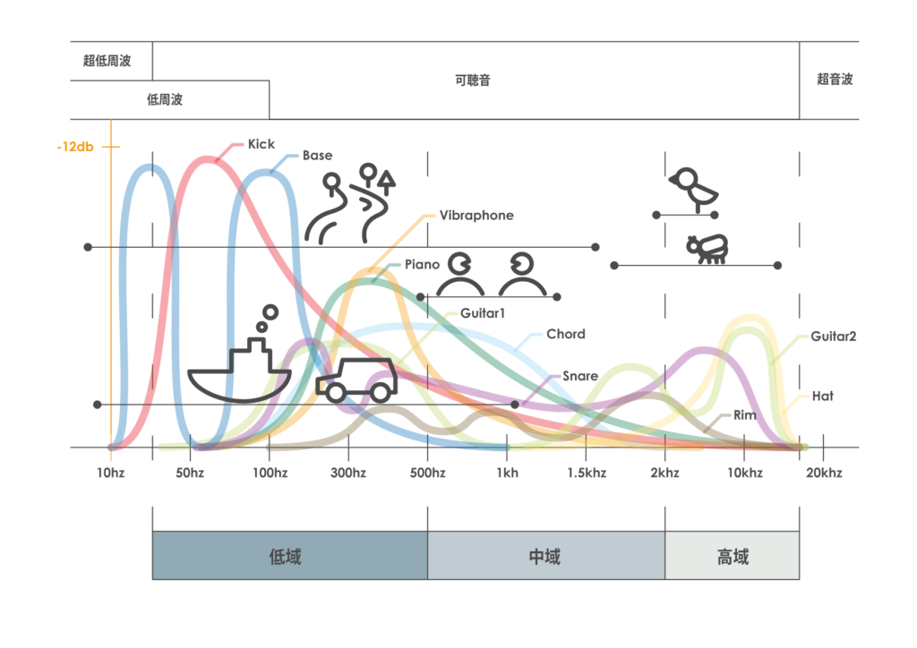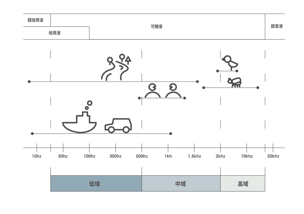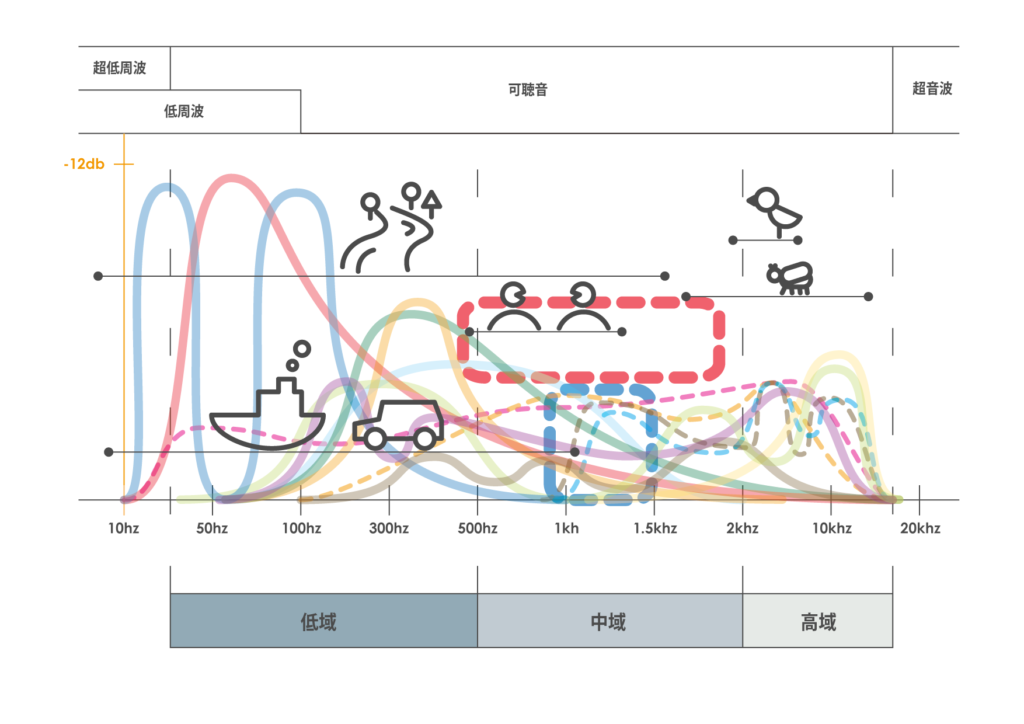 ※周波数帯域の目安(低域0hz〜500hz 中域500hz〜2khz 高域2khz〜16khz)